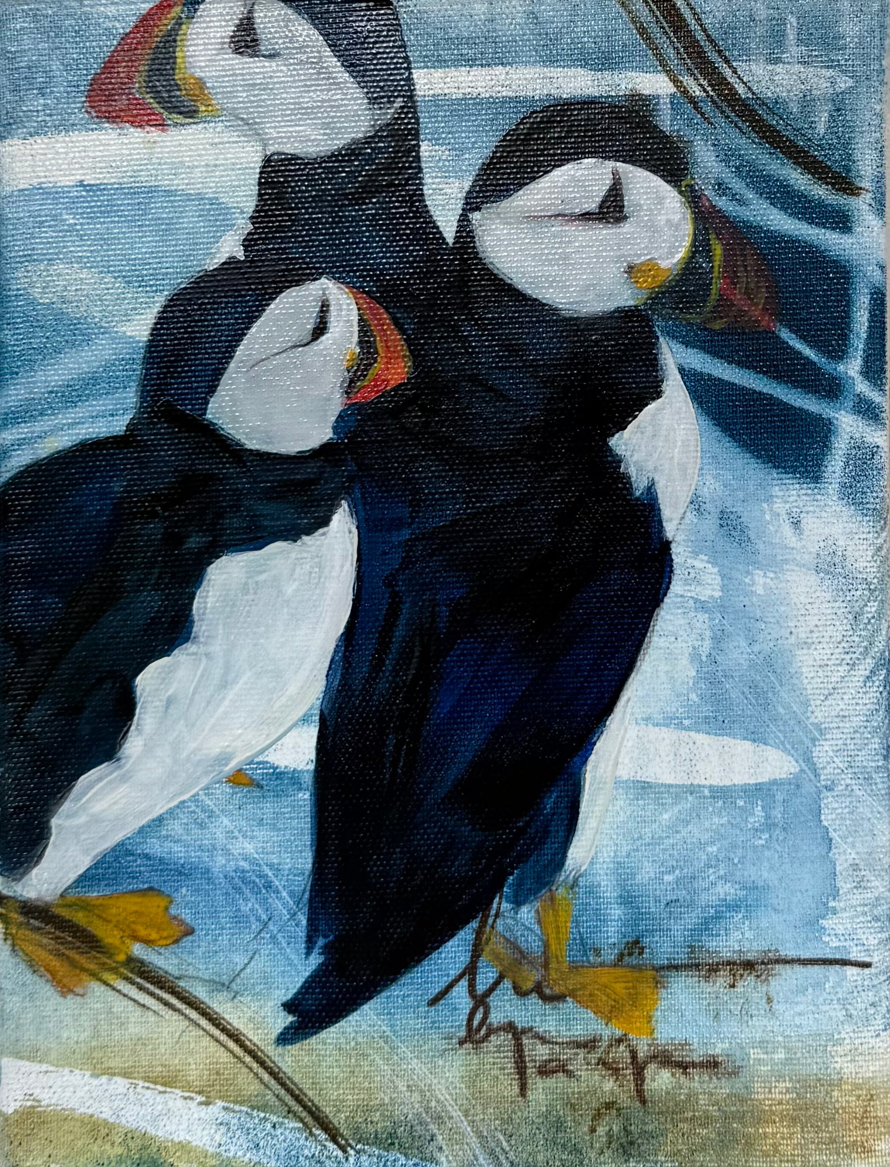 This painting portrays 3 puffins standing close to each other, almost becoming one.