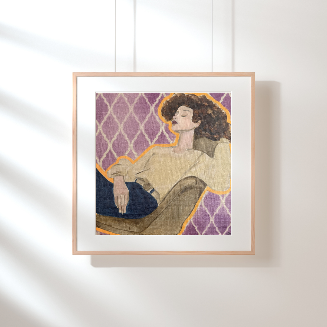 Warm, nostalgic, and heartfelt. En morfar celebrates connection, memory, and comfort. Earthy hues and tender detail create a grounding presence, perfect for bringing soulful character into a home or gallery. The Danish title is a colloquial saying that means 'a nap'.