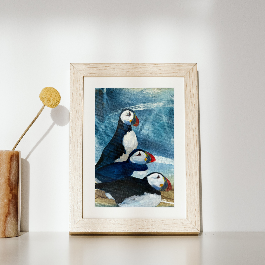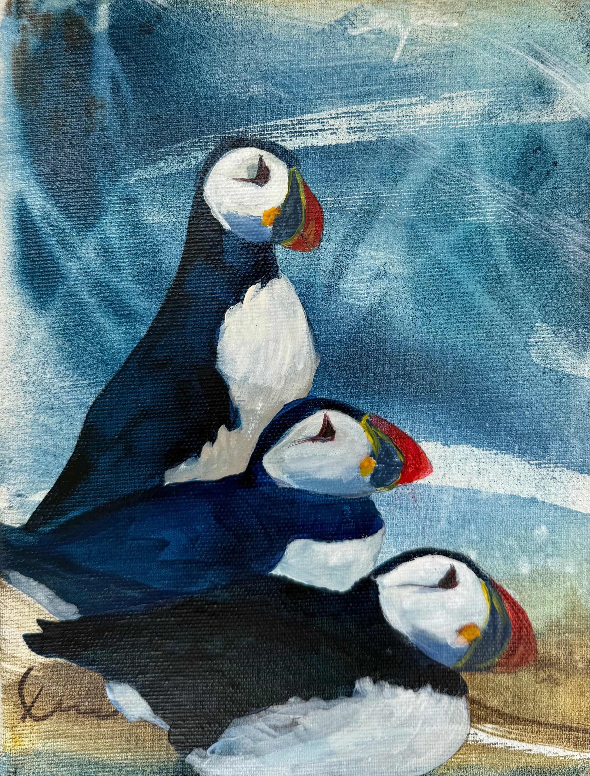 This painting portrays 3 puffins in close proximity - one standing up, and the other 2 lying down - the essence of life.