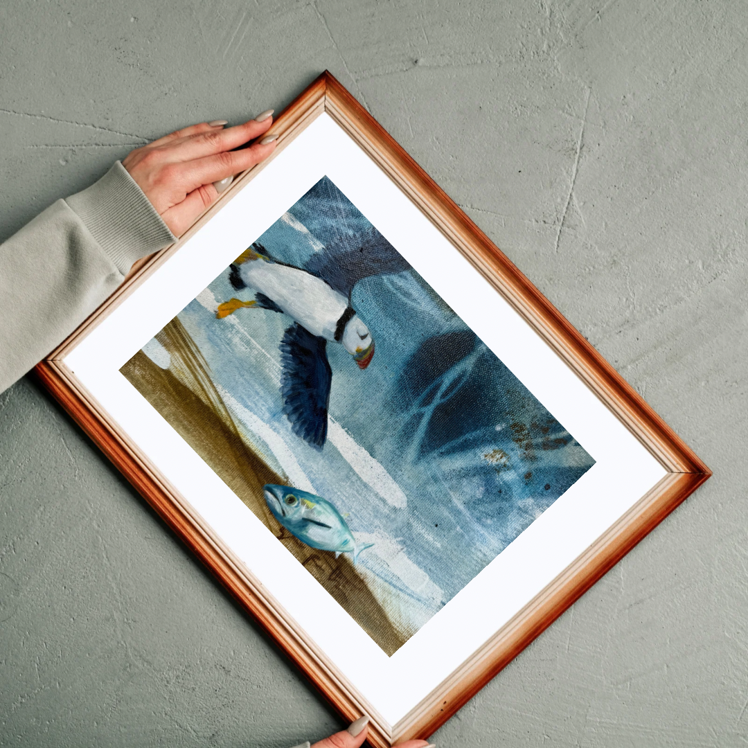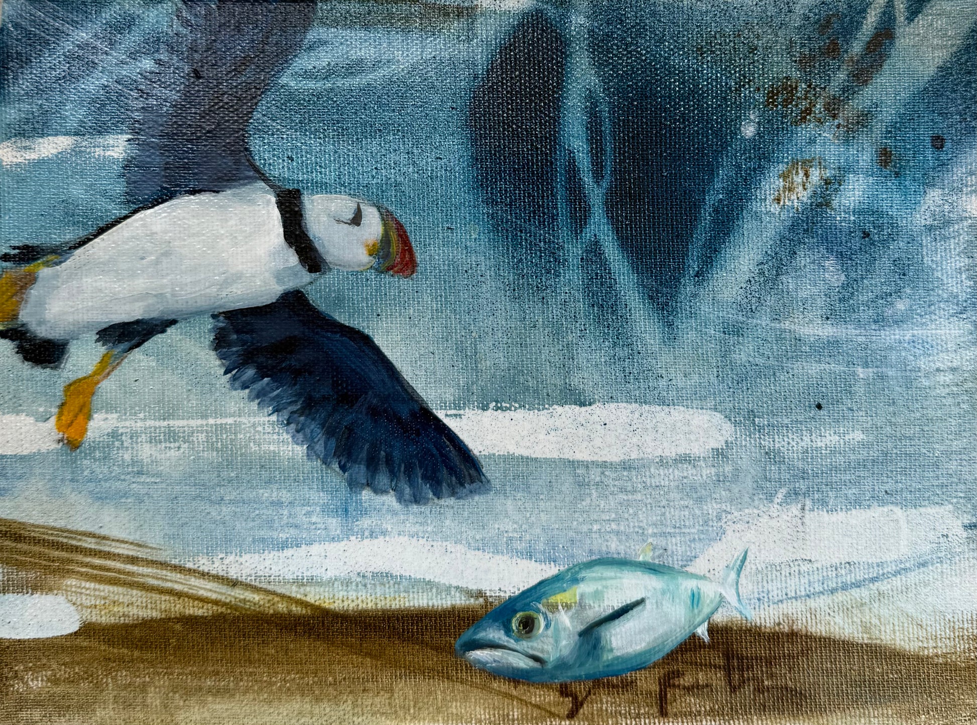 This painting portrays a puffin drifting high in the sky flying over a lonely fish