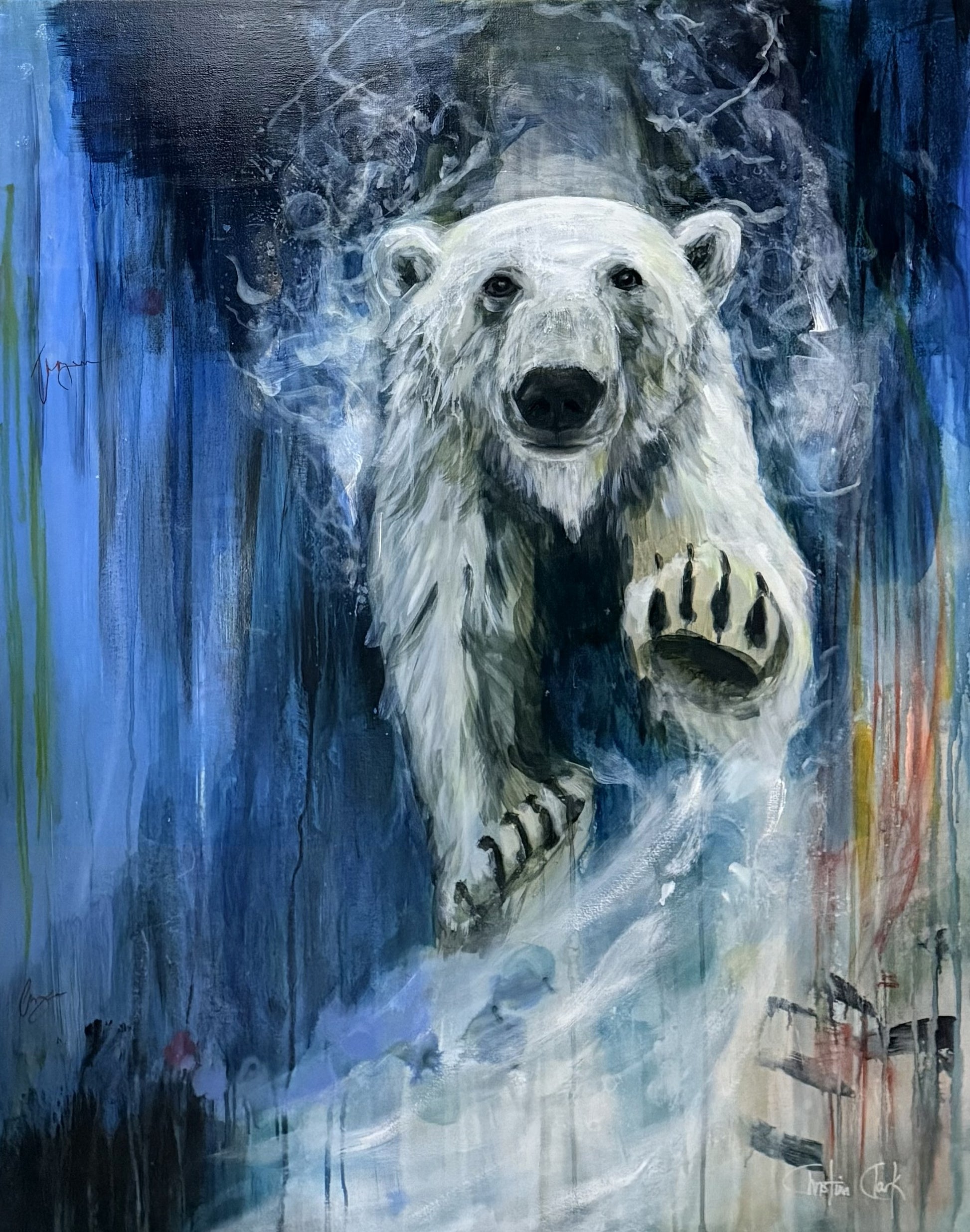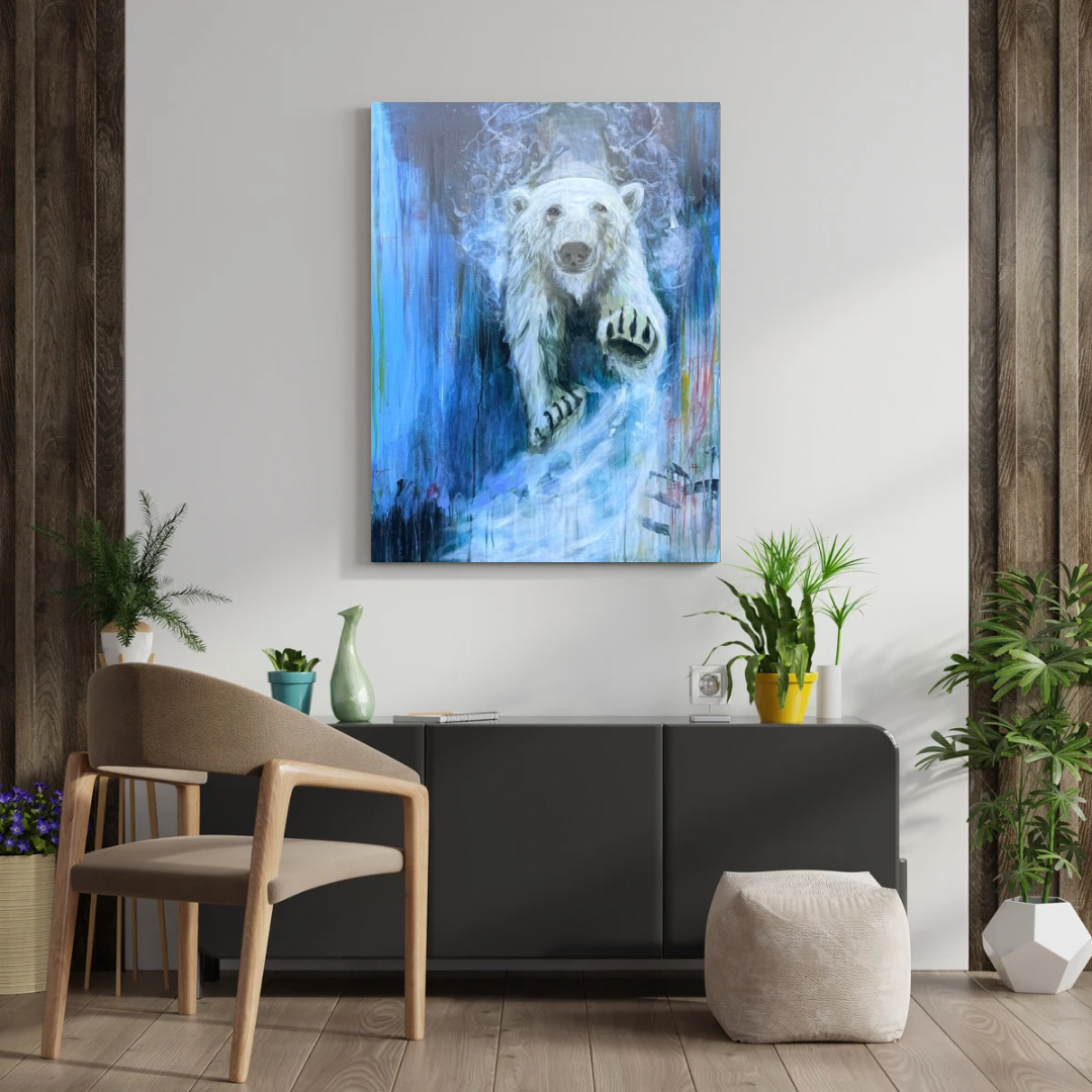 A polar bear in mid-jump, diving boldly into the ocean and meeting your gaze head-on. A symbol of courage, and, that joyful leap we all make into new beginnings.