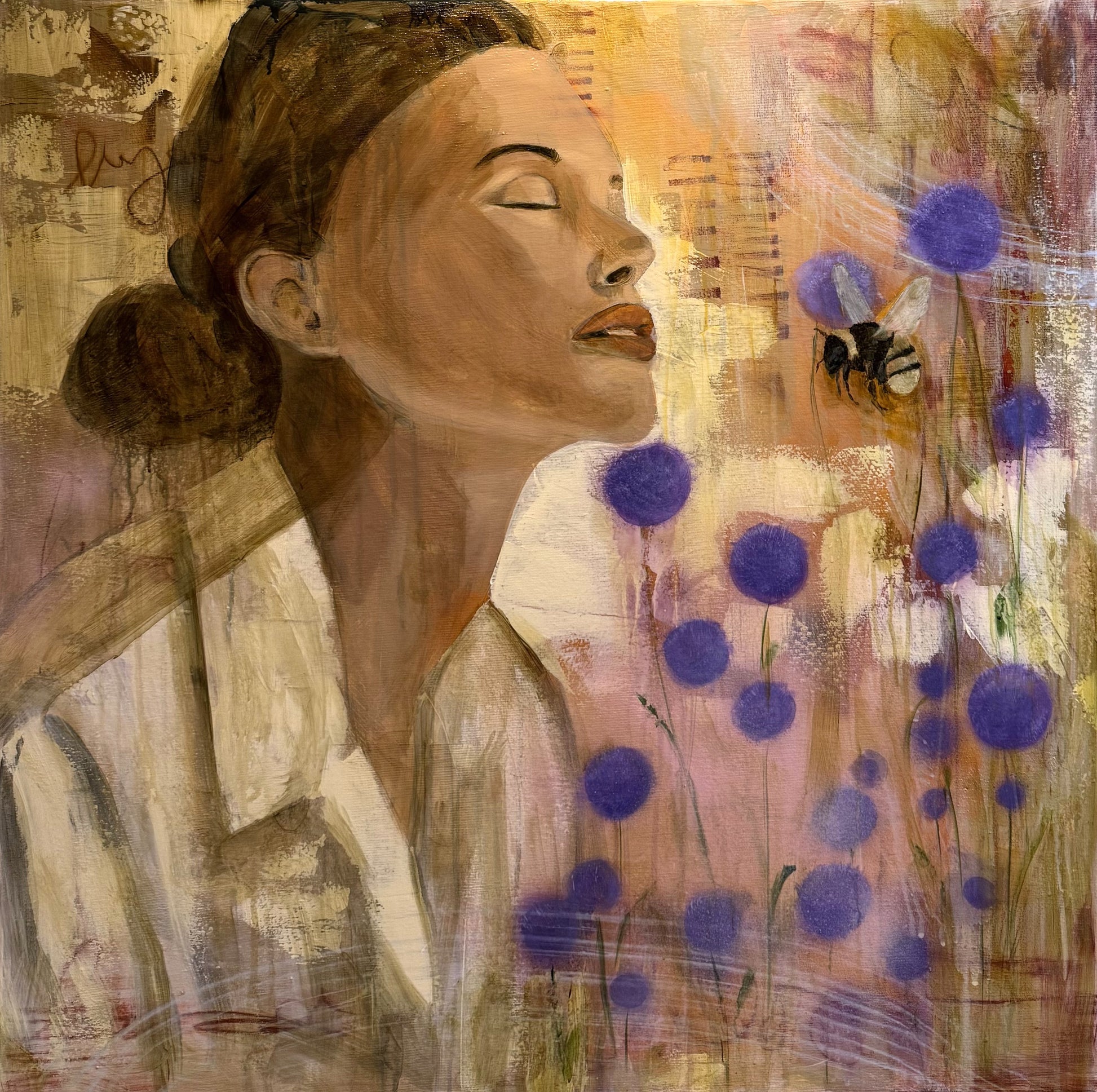 A woman feeling the warm sun on her face, her eyes are closed, enjoying a quiet moment outside, a bumblebee is buzzing close by. A truly calming moment.